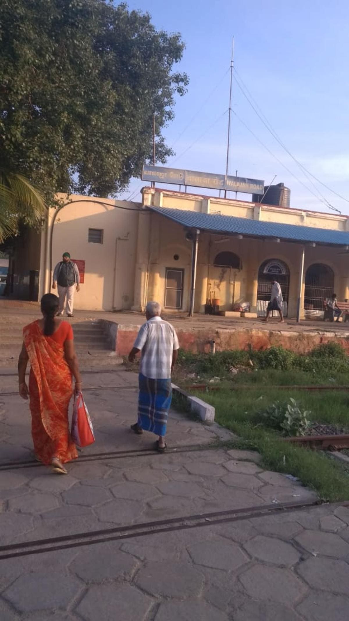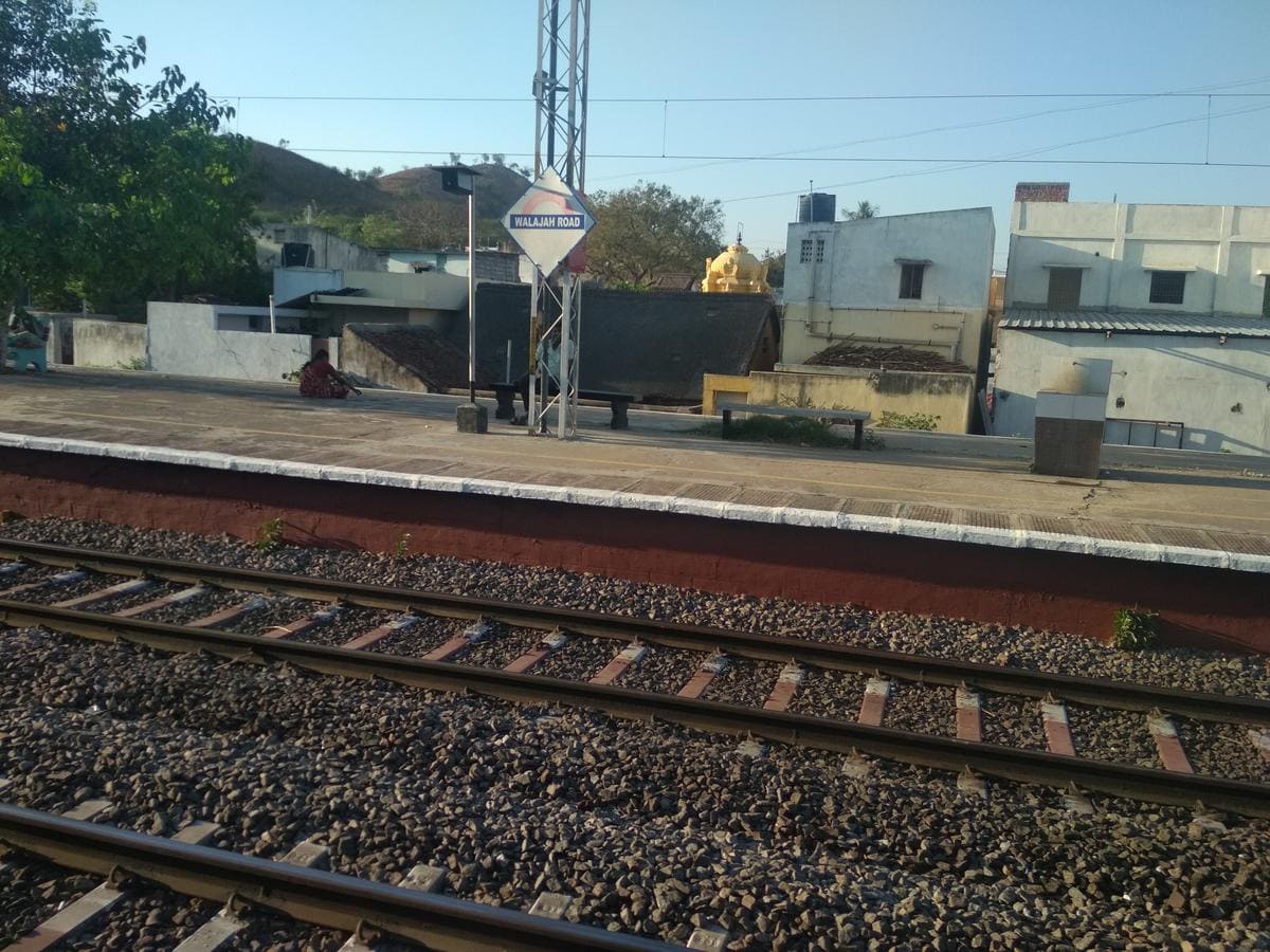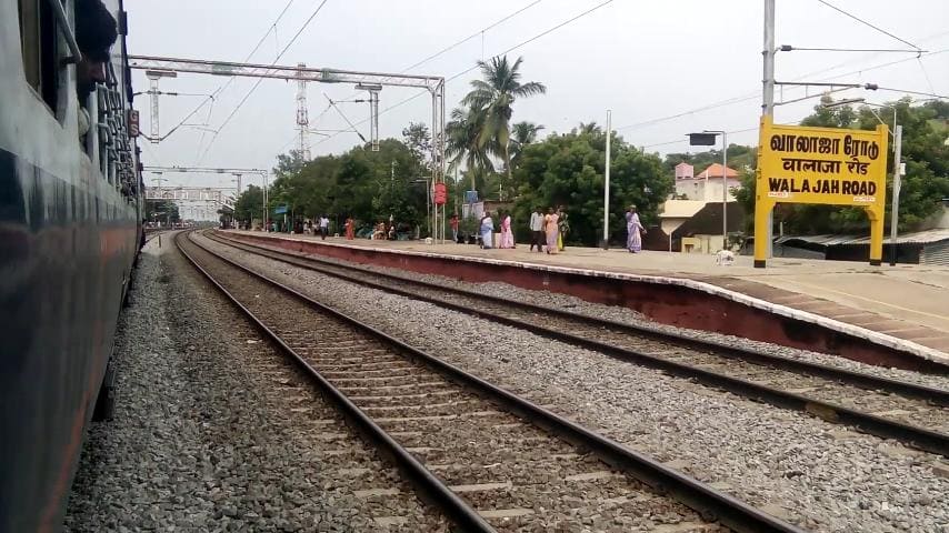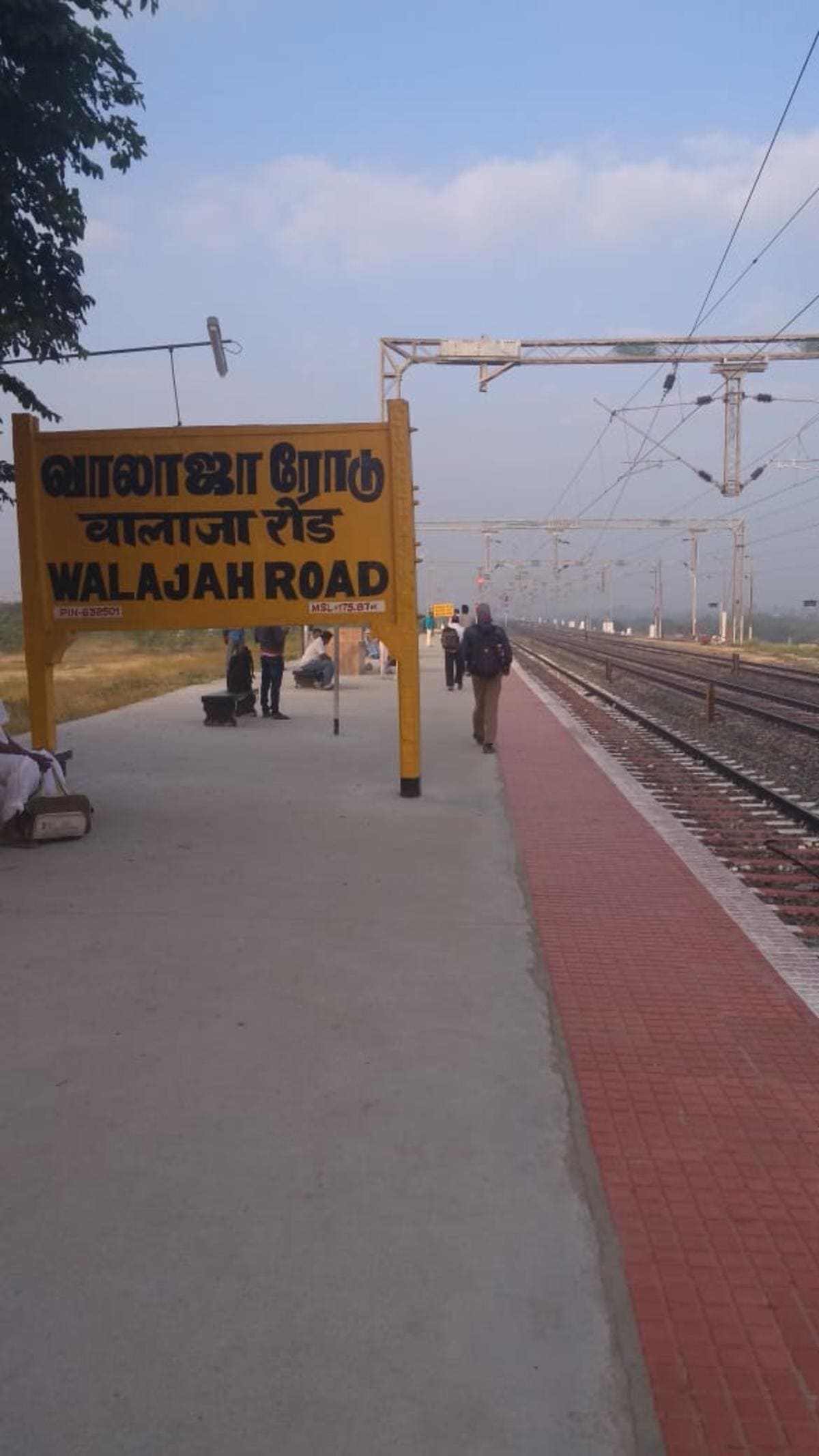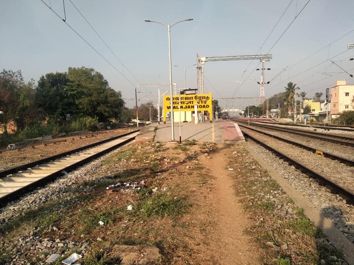 Walajah Road Junction has three platforms, connected by a foot overbridge. The tracks are broad gauge and fully electrified, which is standard for this route now. There are multiple lines running through the station, allowing trains to pass, cross, or wait when needed.